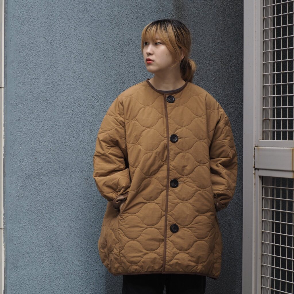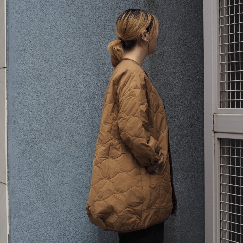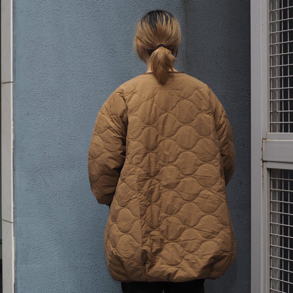 タックやギャザーを駆使して作られたコクーンシルエットがいつものキルトコートのスタイルとはひと味違うイメージにしてくれるはずです。愛らしい丸みのある雰囲気に。