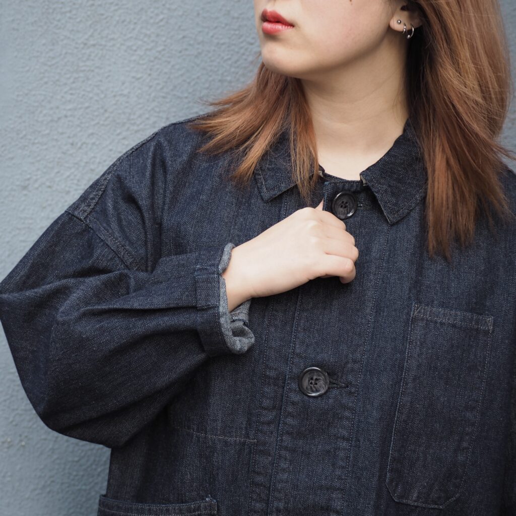 ボクシーなカバーオールらしいゆとりのあるサイズ感に袖のタックなどで丸みを加えたシルエット。
