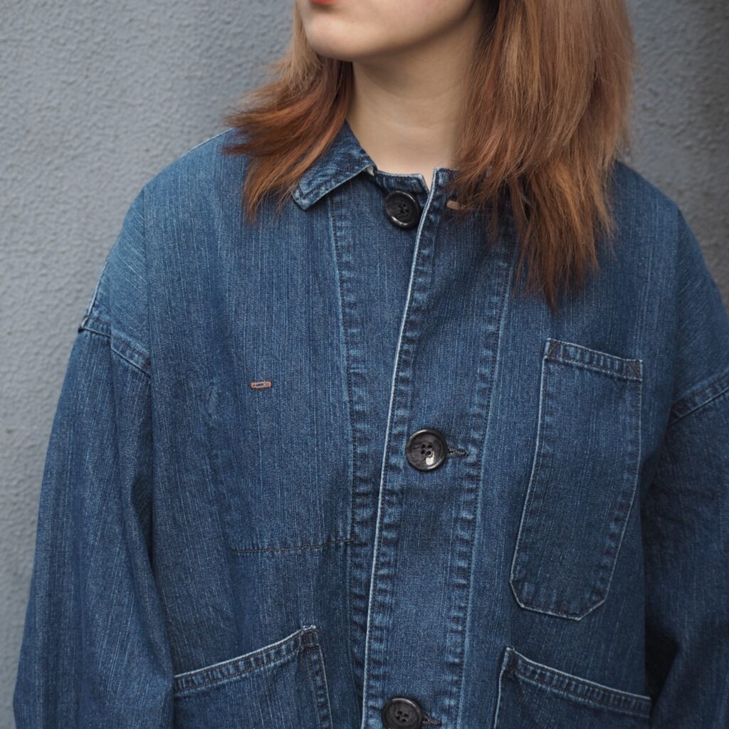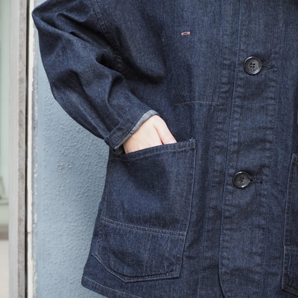 胸のボタンホールのディティールは本来は社員証やバッジなどをつける用のワークディテールでデザインのポイントになっています。