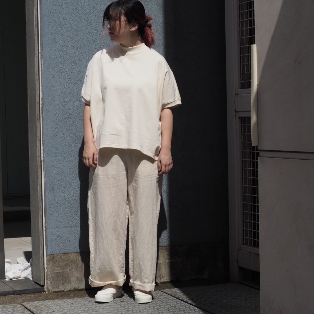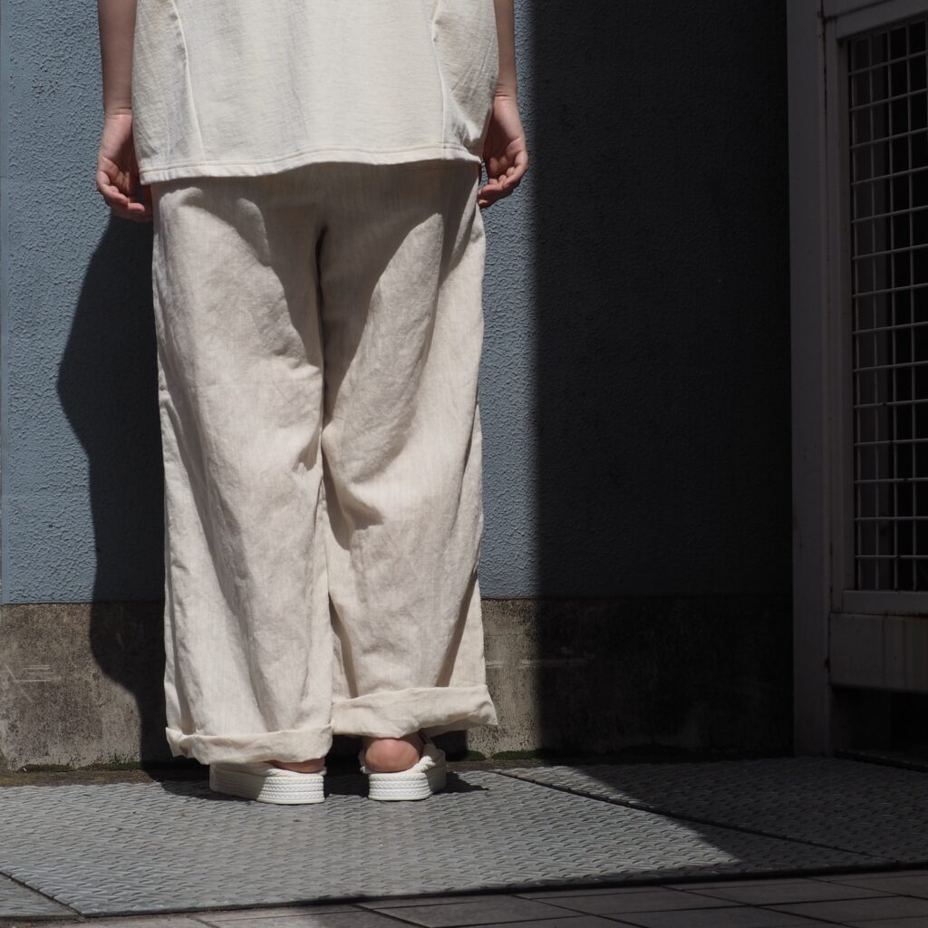 シルエットは、身体のラインを拾いにくい、ゆったりとしたストレート。リラックス感がありながらも、細部のディテールを整えることで、すっきりと都会的な印象にまとめました。くつろぎの延長線上にあるような穿き心地と、外にもそのまま出かけられる品の良さを併せ持ったボトムスです。