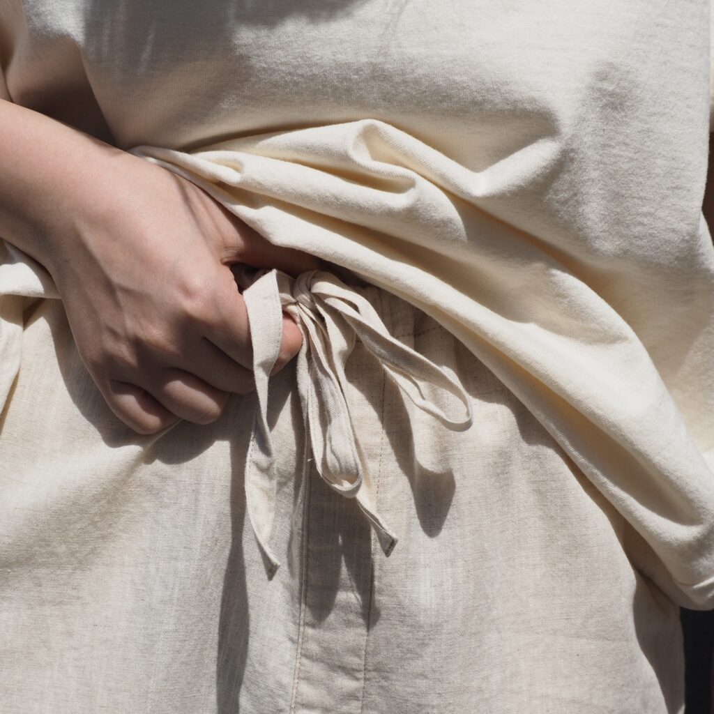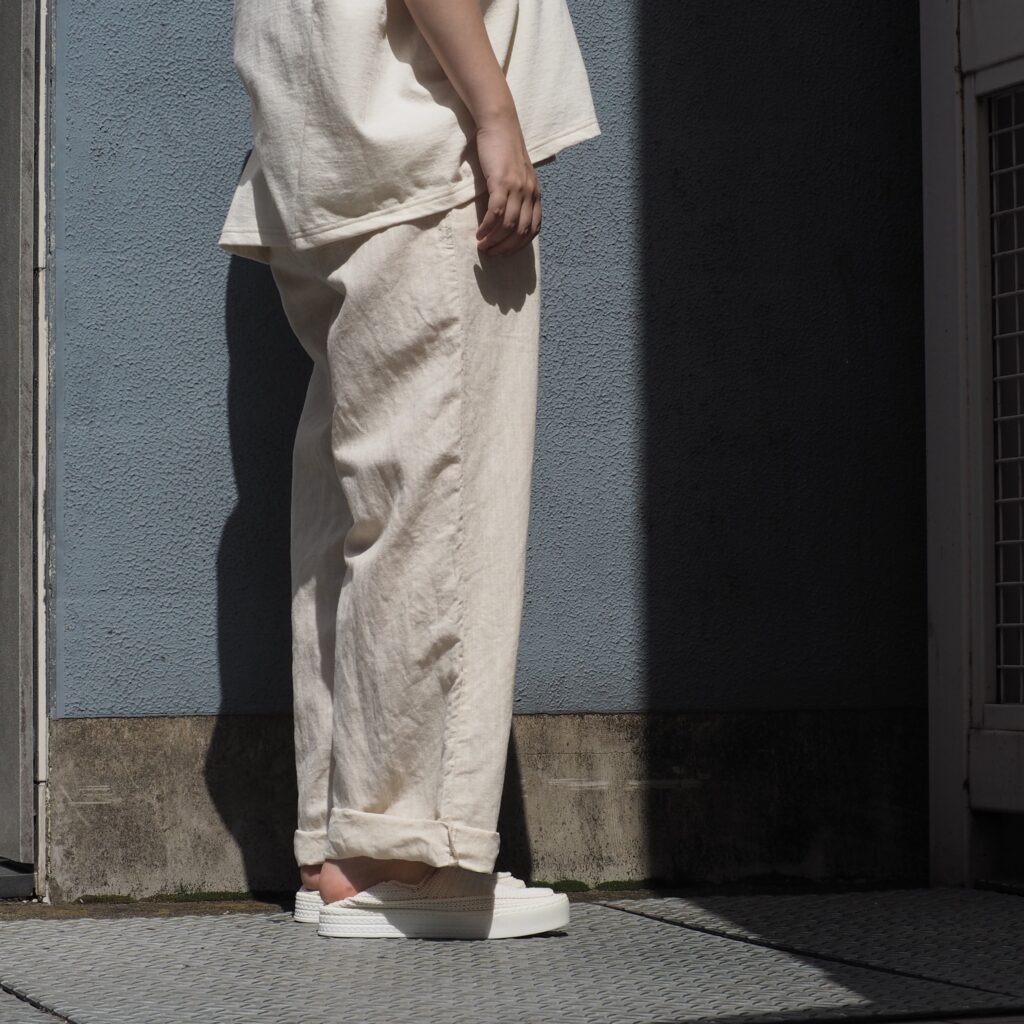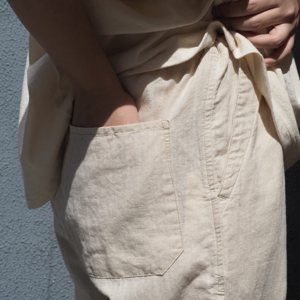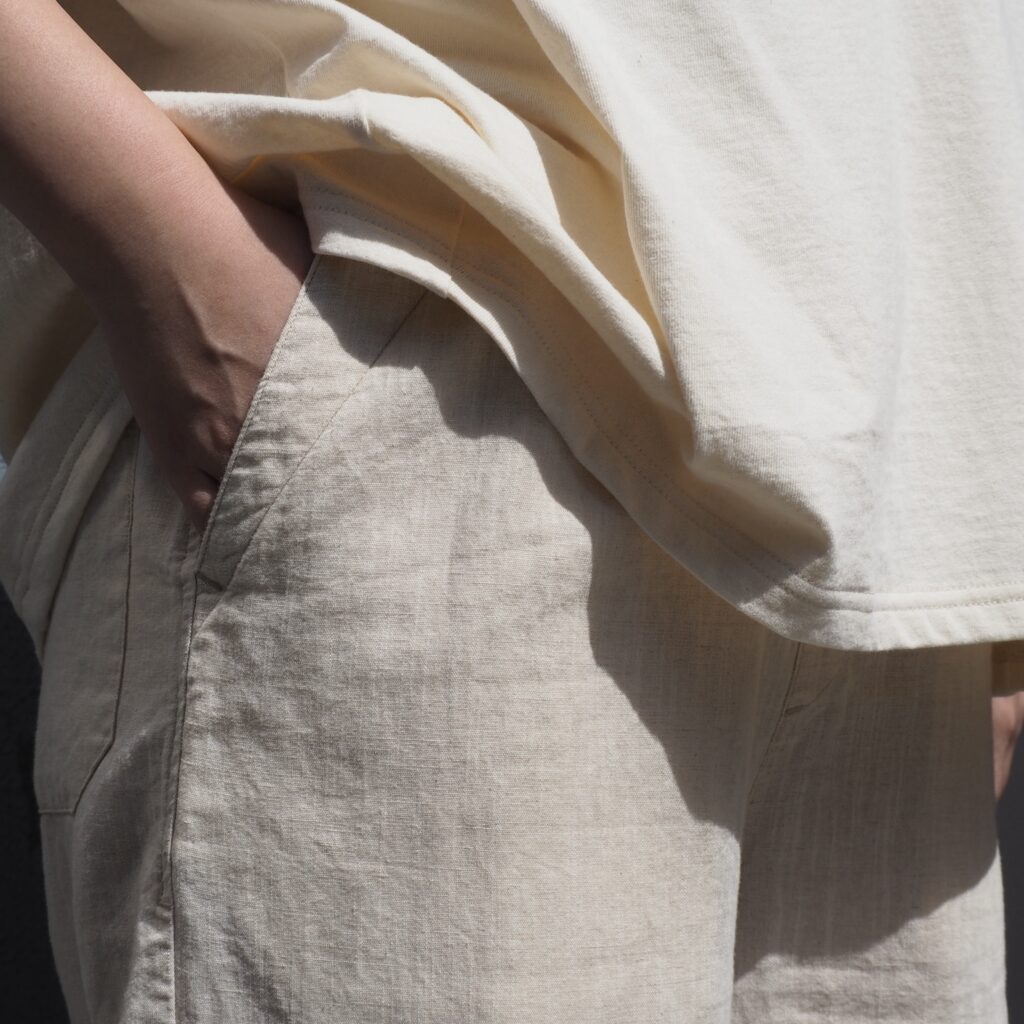 生成りならではの素朴な色合いの中に、ムラ糸がつくる節の表情が浮かび上がり、織りの立体感を楽しめる素材です。麻特有のドライなタッチにコットンのやわらかさが加わり、肌離れが良く、季節を通して心地よく着用いただけます。