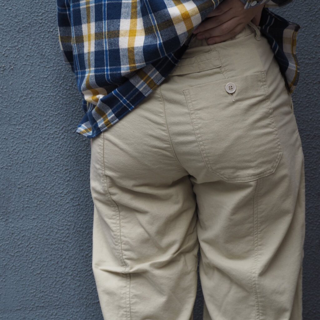 後ウエストはゴム仕様で、サイズ調節を可能にし、ストレスフリーな着心地を実現。尾錠デザインもこだわりのひとつです。