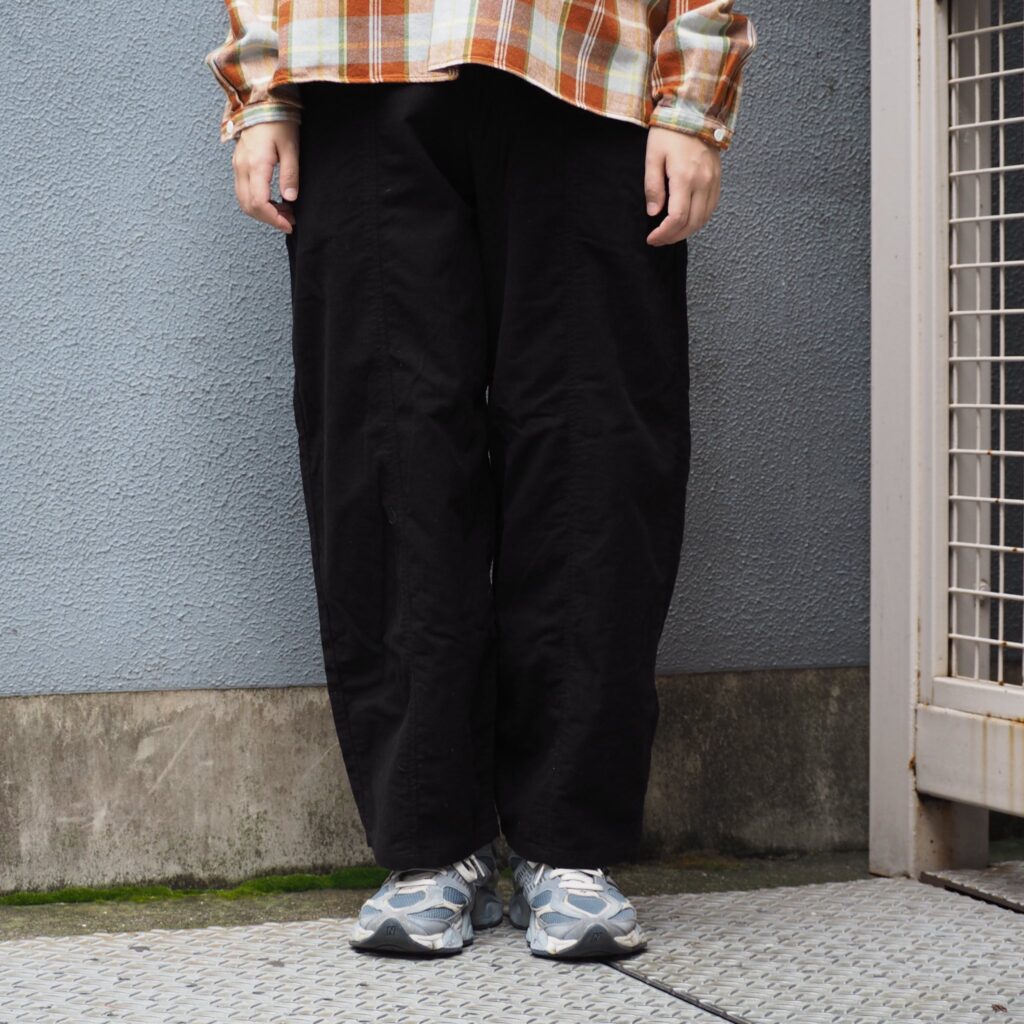 アーモンド形の様に太もも周りにふくらみを持たせ、丸みのあるリラックス感のあるシルエット。フロントの切り替えデザインにより、全体的なボリューム感を持たせながらも裾に向かって狭くなり、メリハリをつけてスッキリとした印象に仕上げました。ボリュームがありながらも、ワイドパンツのように広がらず、ほんのりと丸みのあるきれいなシルエットを作ります。