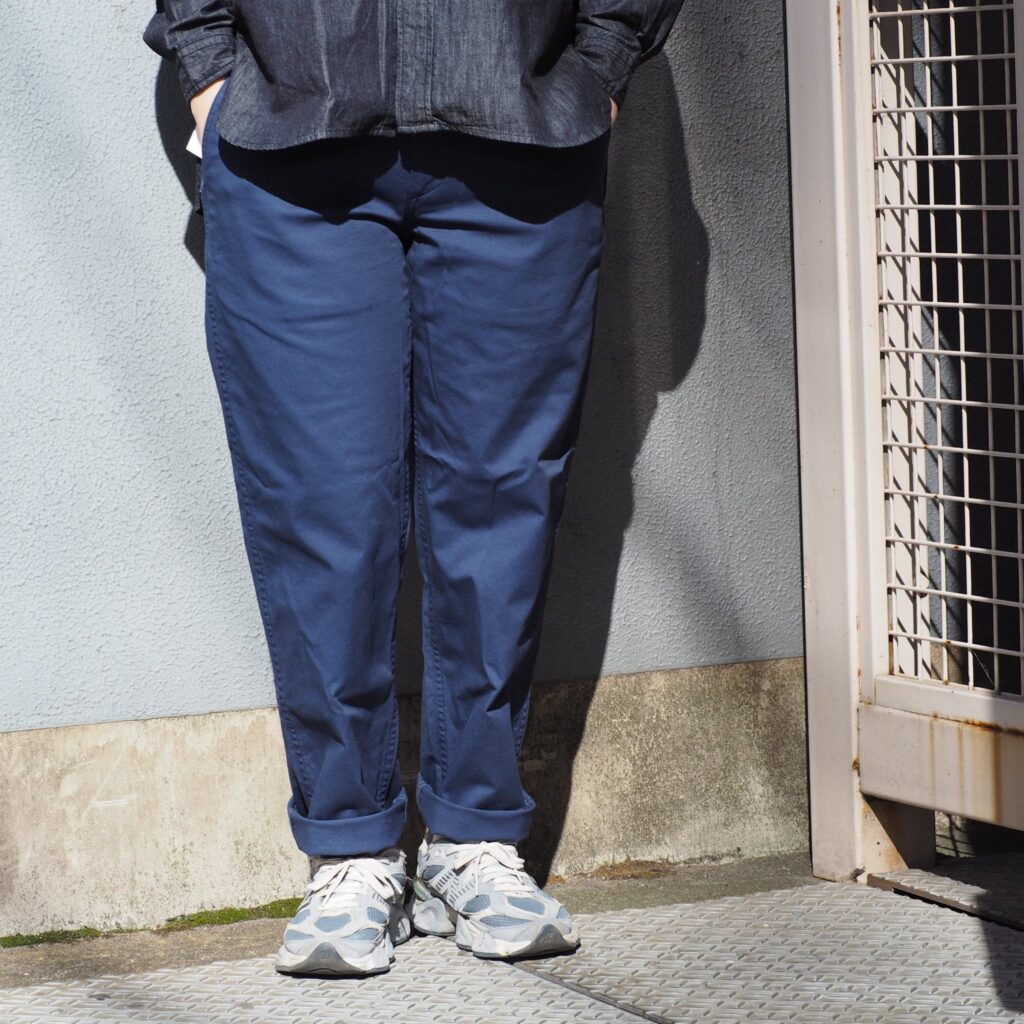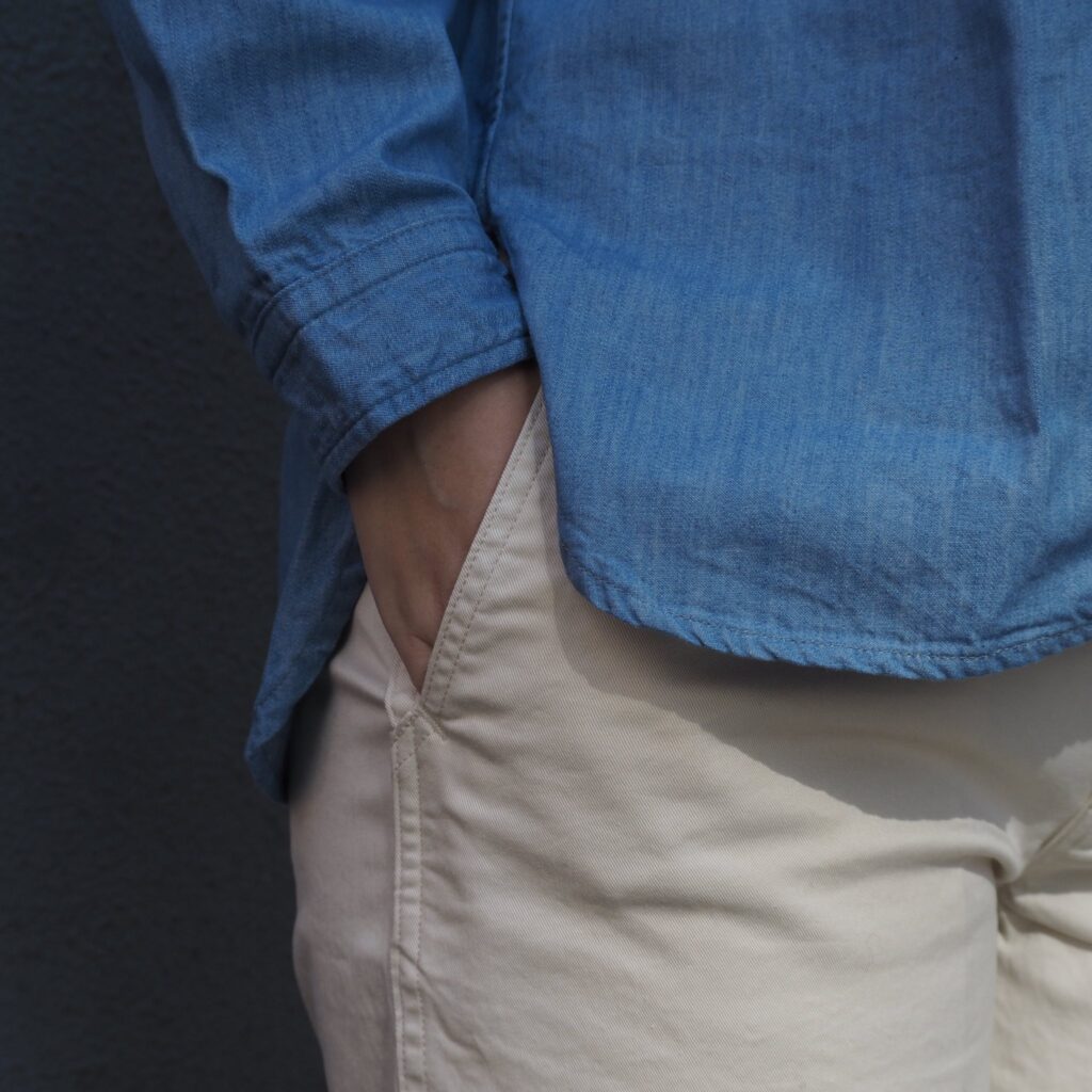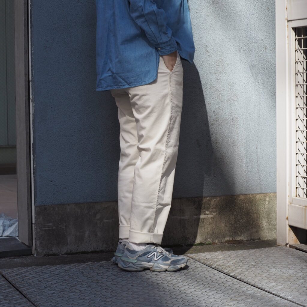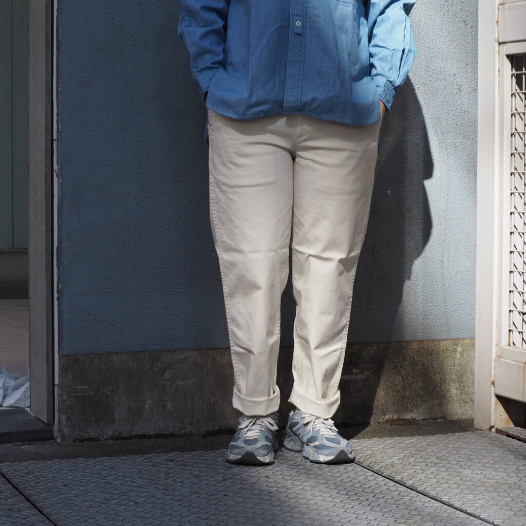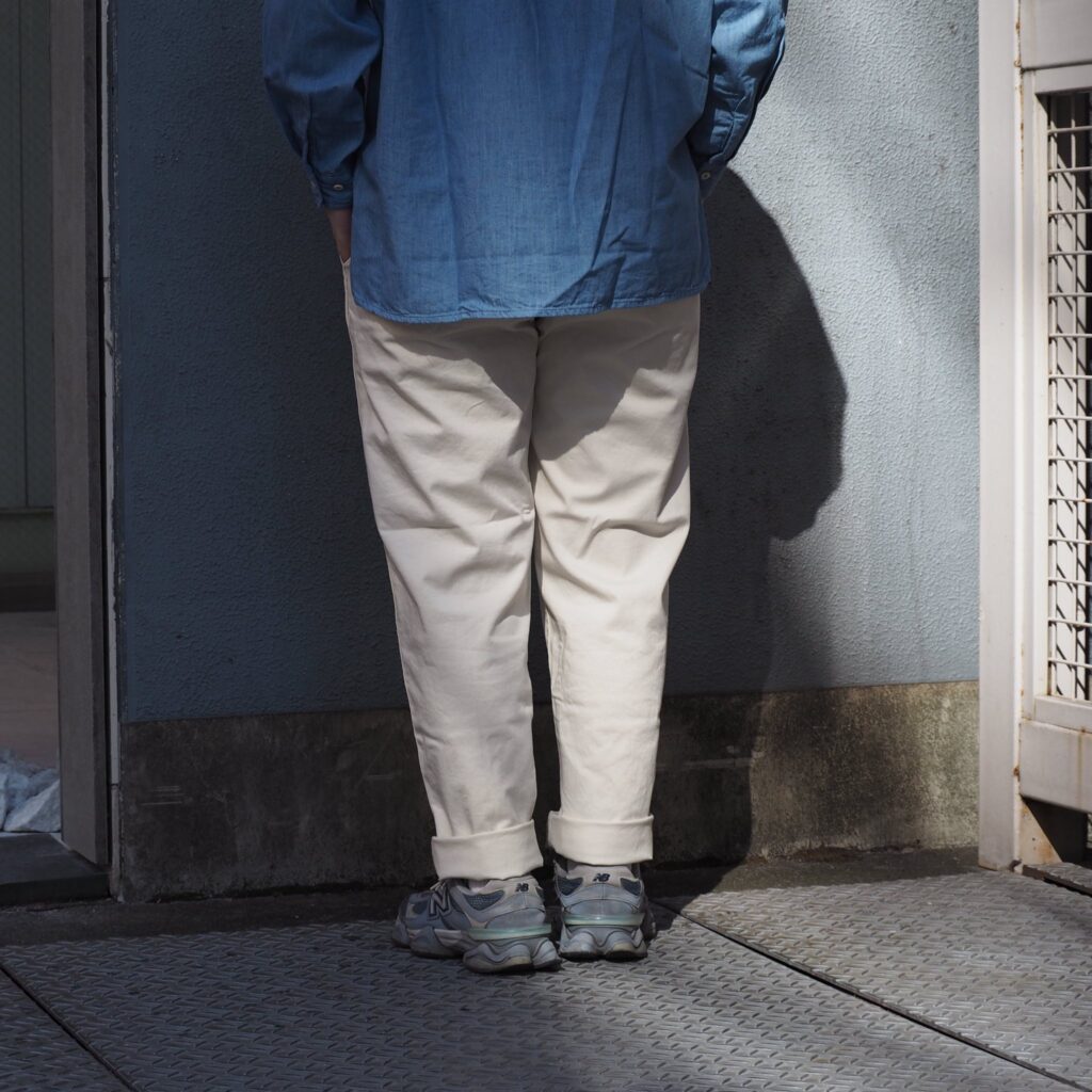 内腿の巻き縫いや二本針の縫製仕様にもこだわり、毎日履いても型崩れしにくいタフさも特徴。