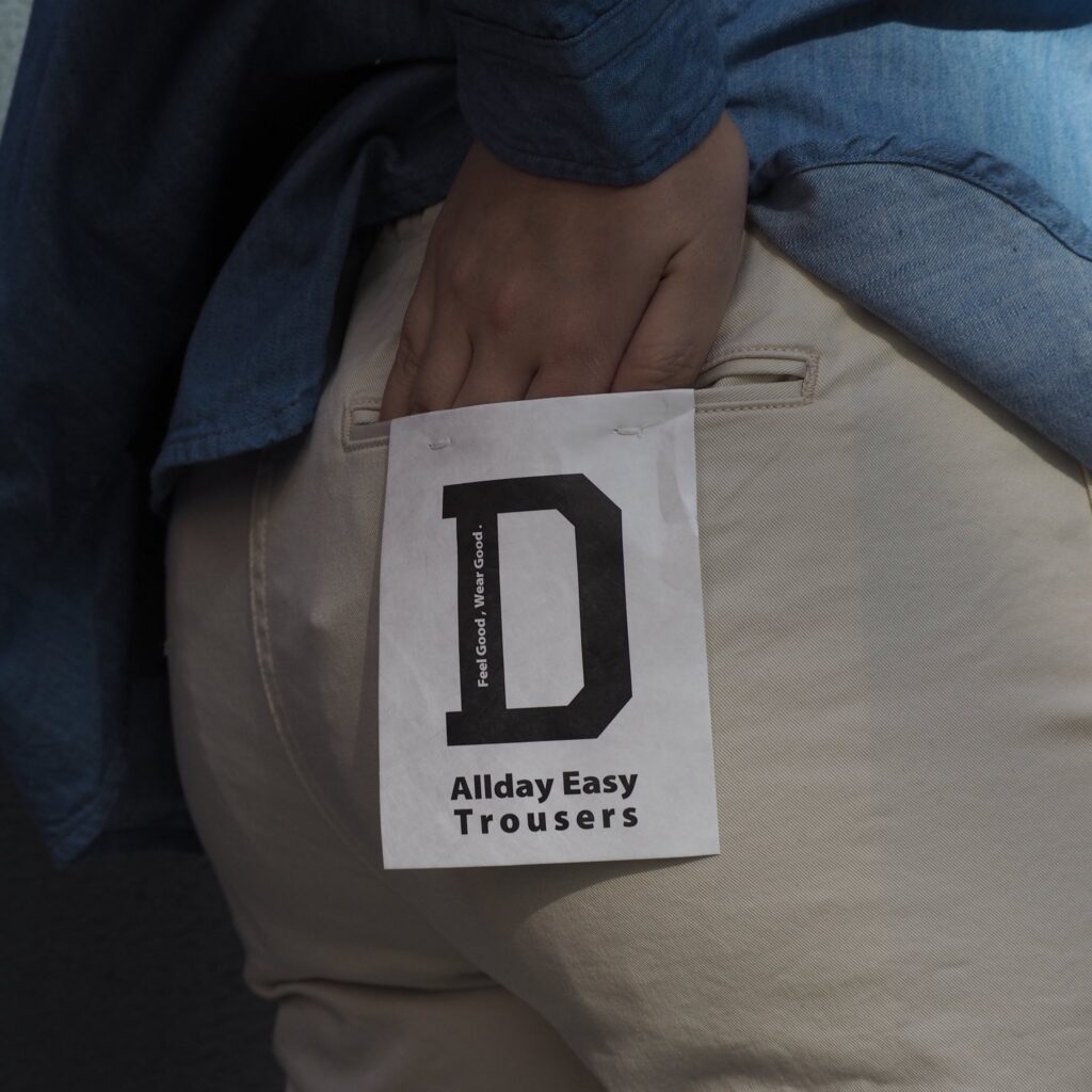 「朝から夜まで、からだが喜ぶボトムス。」をテーマに開発した、一日中履いても快適な”D.M.G.”の新定番イージーパンツ《オールデイイージートラウザー》。