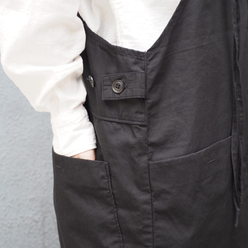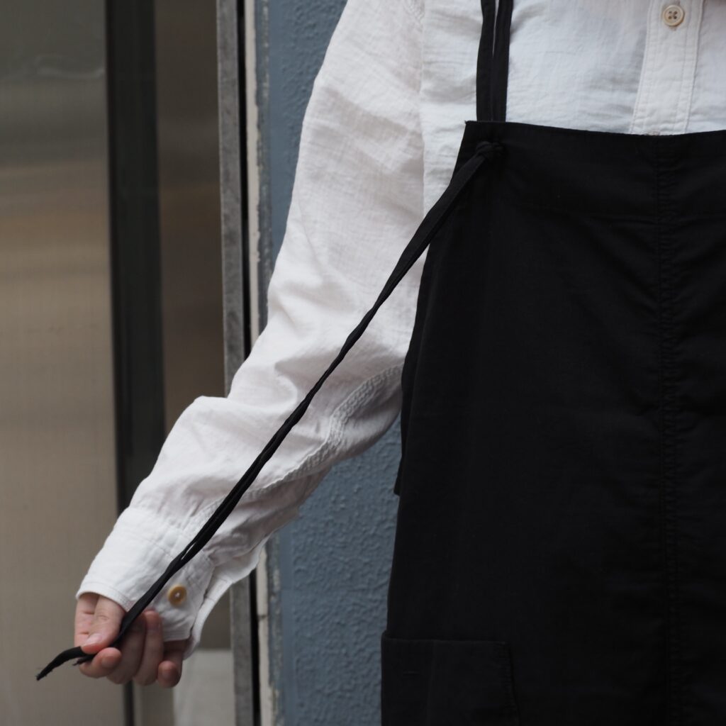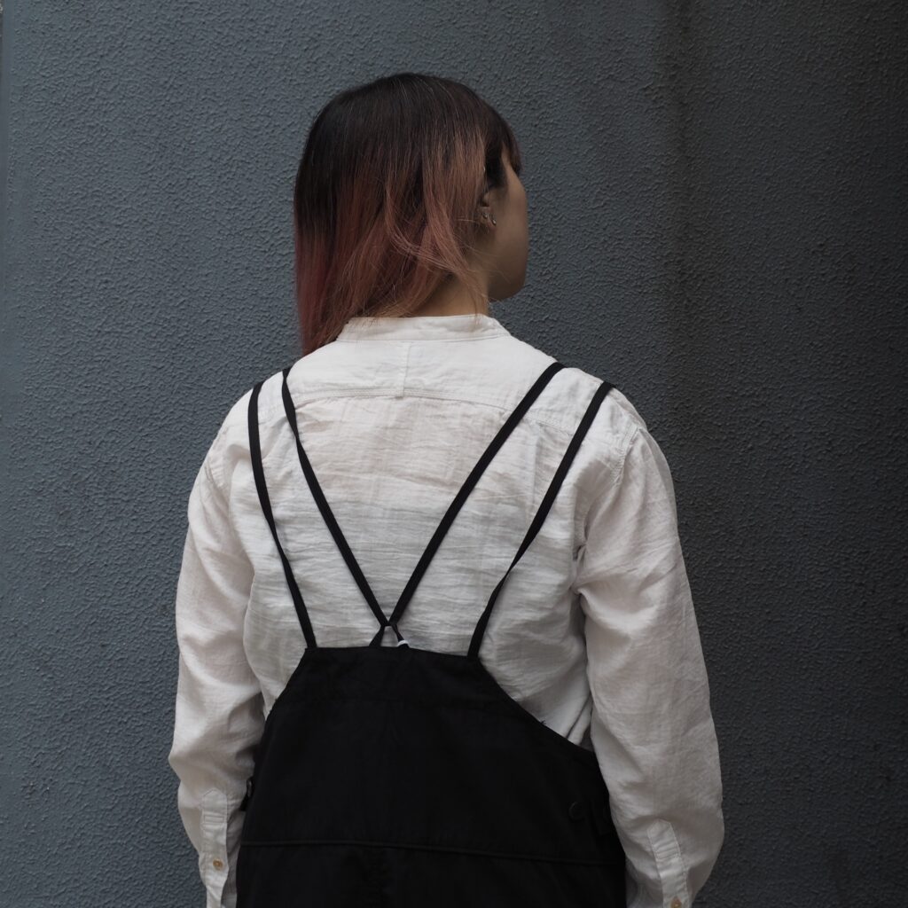 2本の吊り紐を施した着丈の調節が可能なサロペットパンツ。