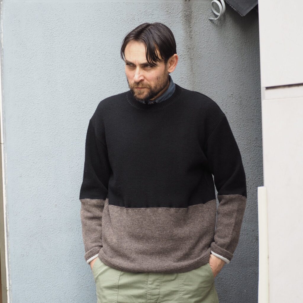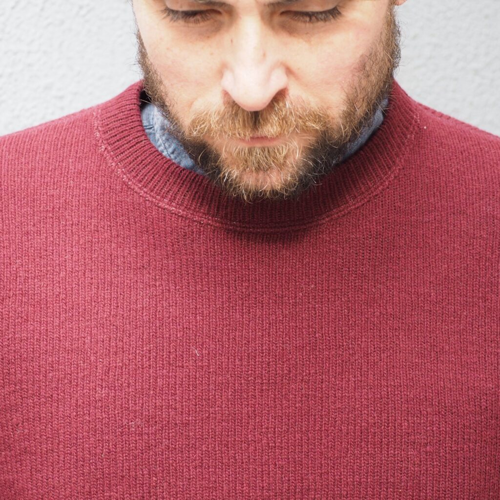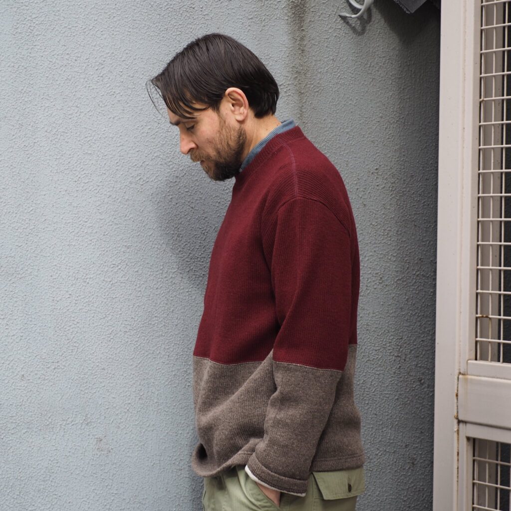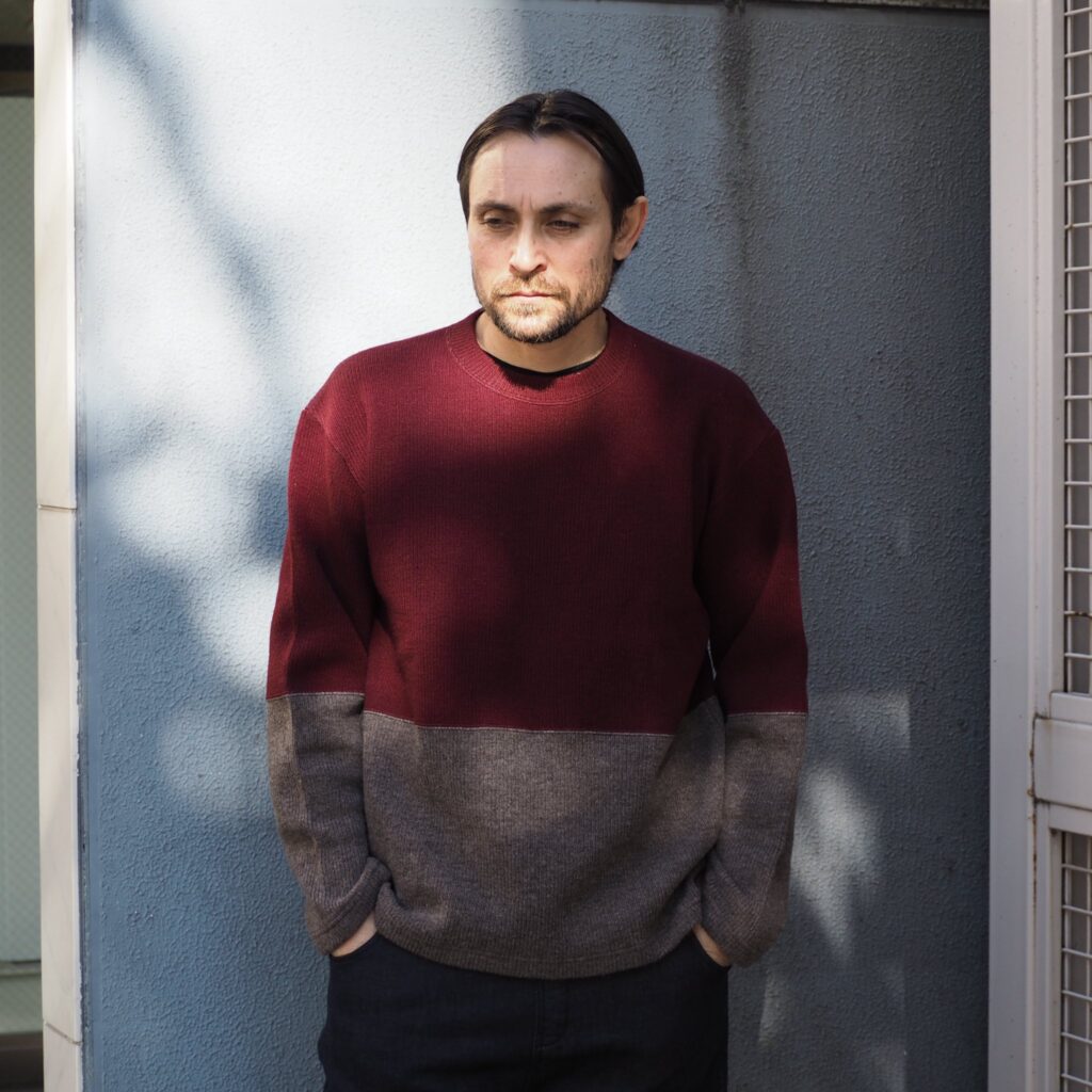 表がローゲージ編み、裏がハイゲージ編みの特殊接結編みを施したクルーネックセーター。