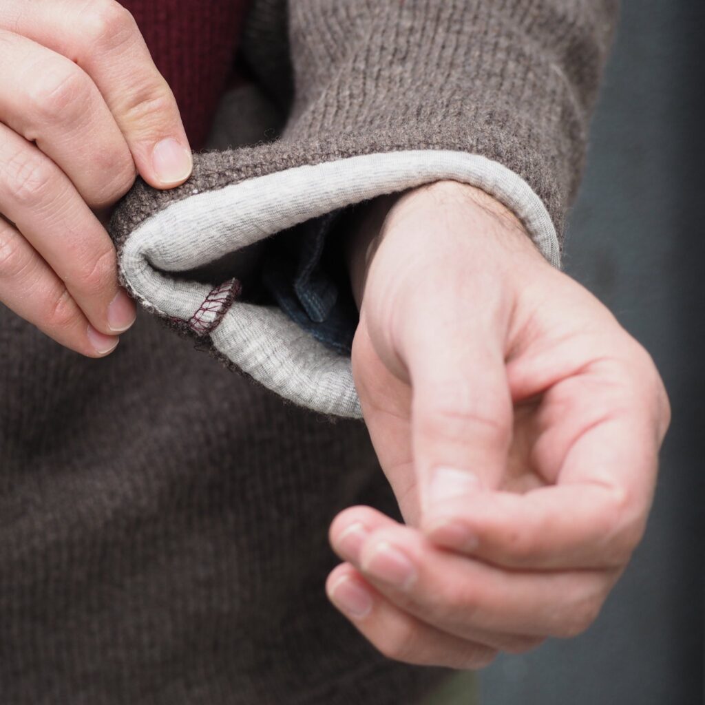 表面の立体感ある編み地と、裏面の滑らかで肌触りの良いコットンが絶妙に組み合わさった上質なニットです。