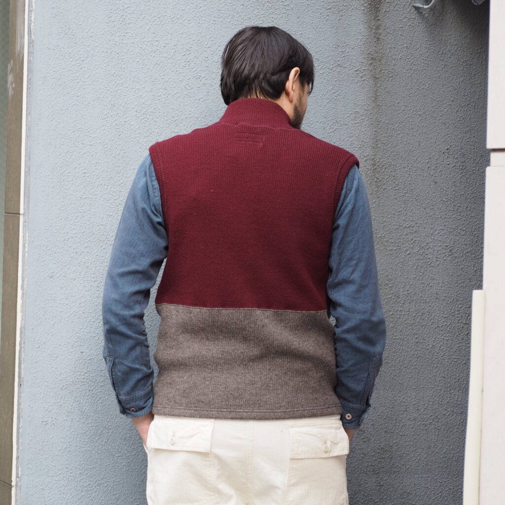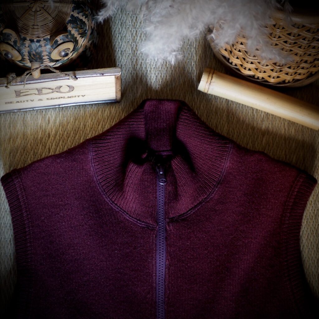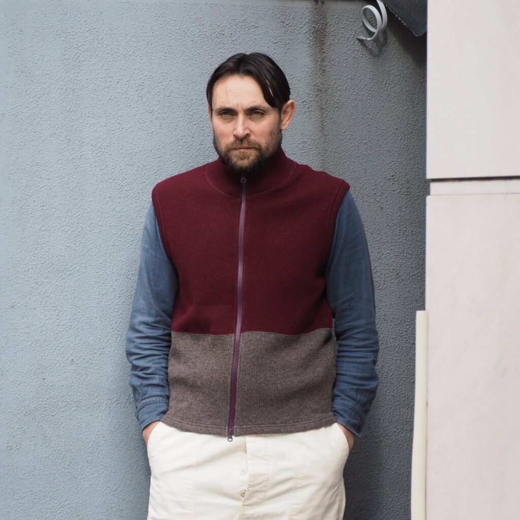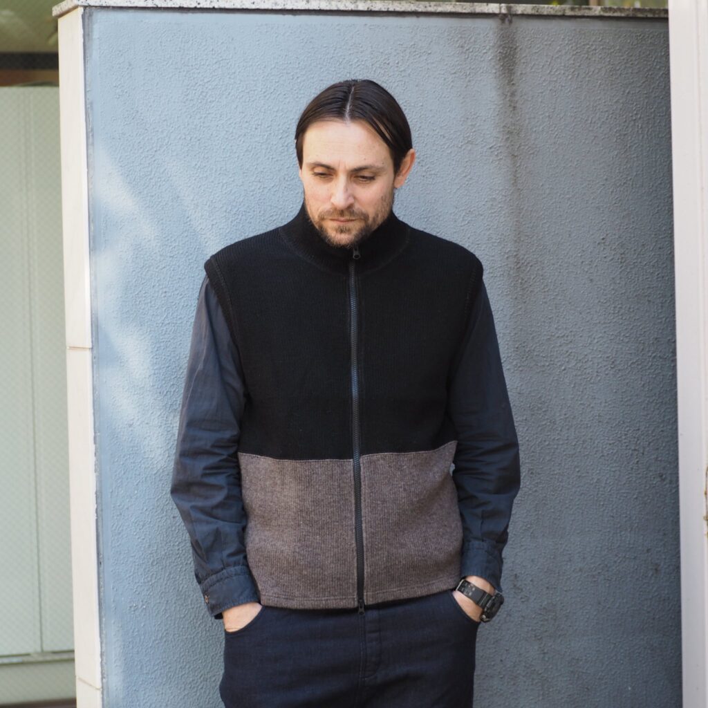 表がローゲージ編み、裏がハイゲージ編みの特殊接結生地を使用した、スタンドカラーのジップアップベスト。