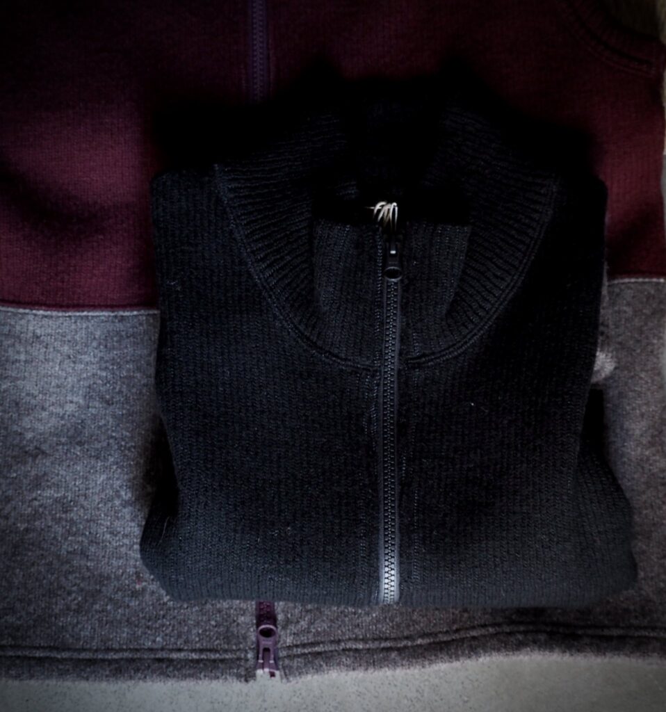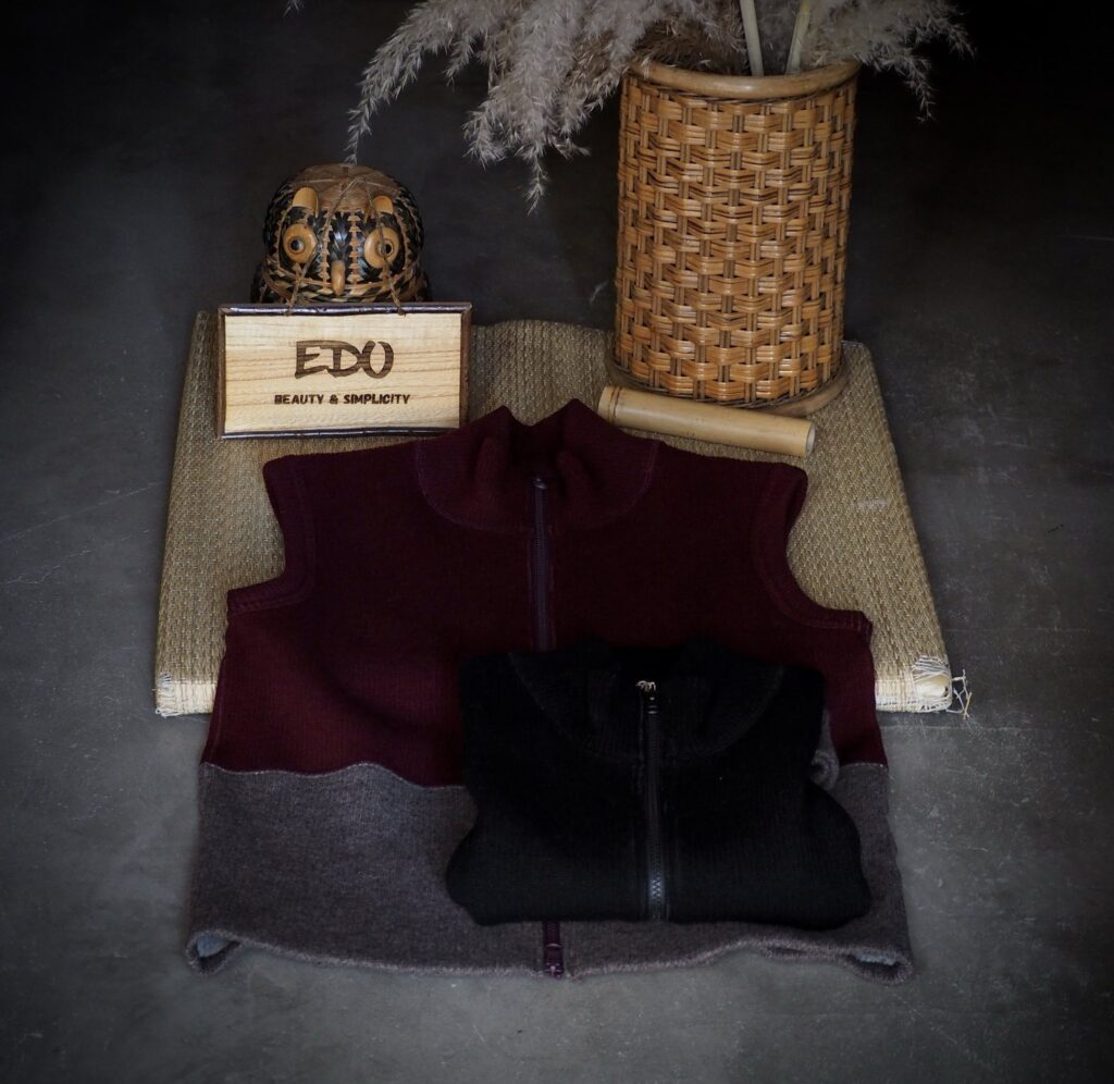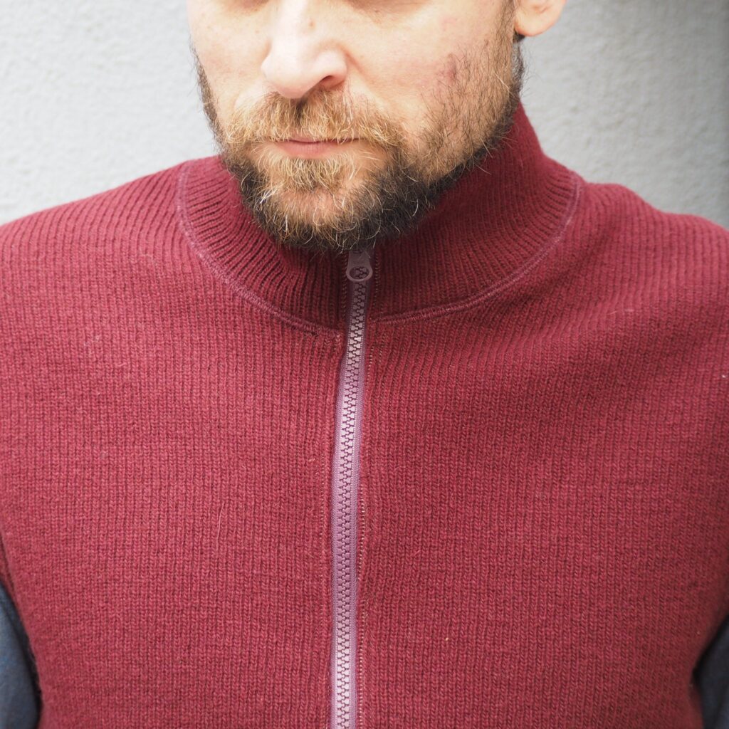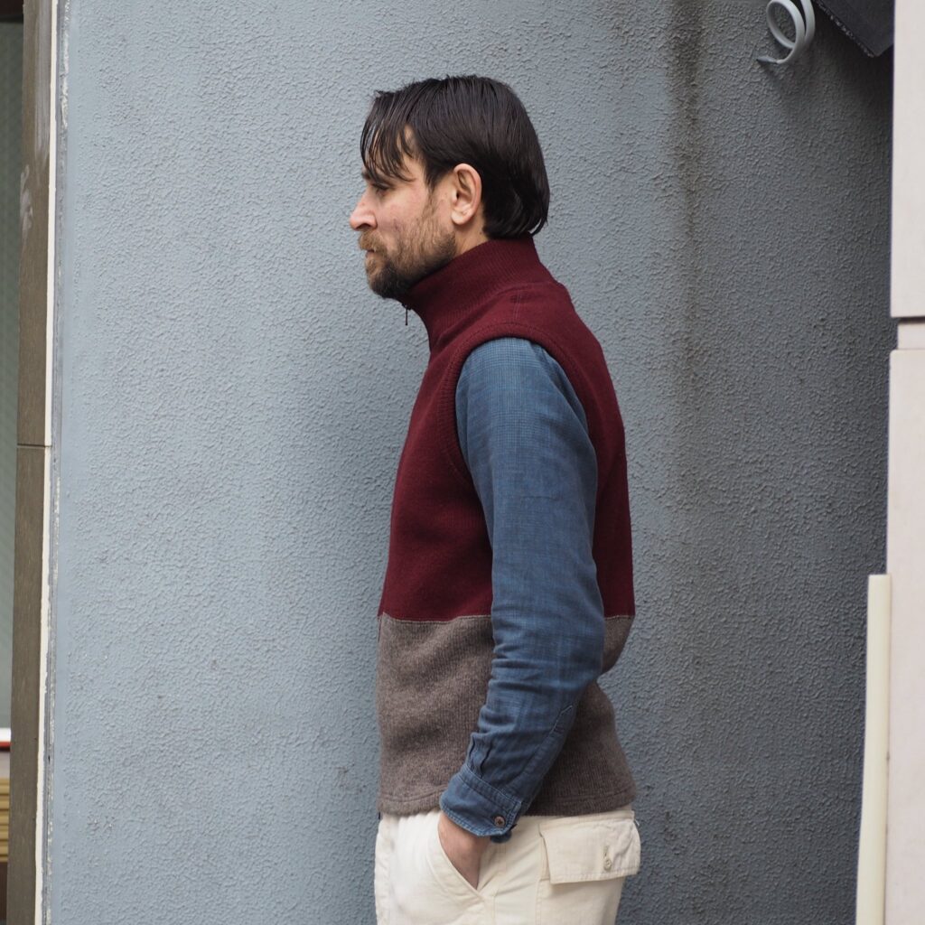 表がローゲージ編み、裏がハイゲージ編みの特殊接結生地を使用した、スタンドカラーのジップアップベスト。