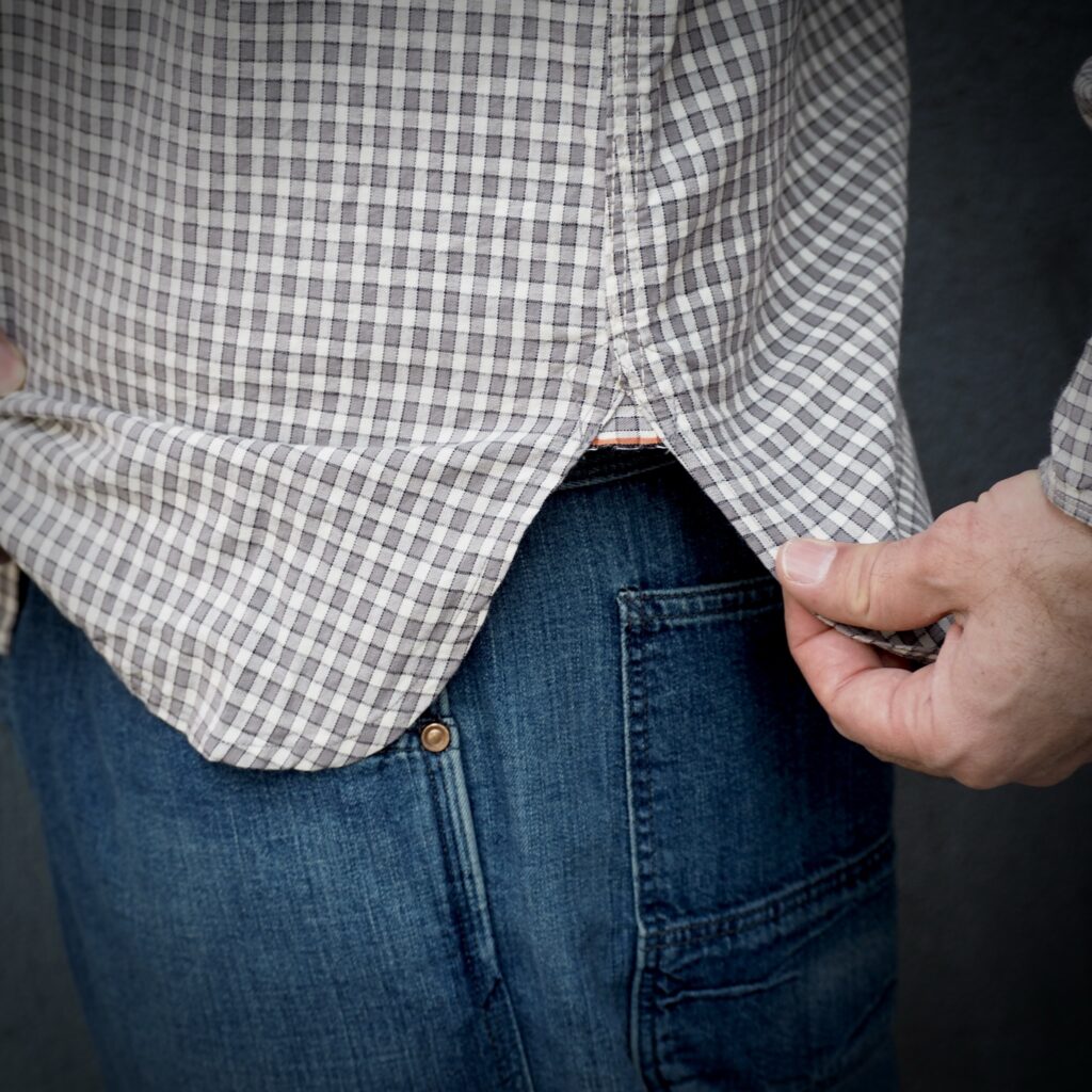 岡山県井原市の旧力織機で織り上げたオリジナルギンガムチェックシャンブレー生地は、ゆっくりと少しづつ生地を織り上げるため、糸本来の凹凸やムラ感が残りあたたかみのある質感が特徴です。