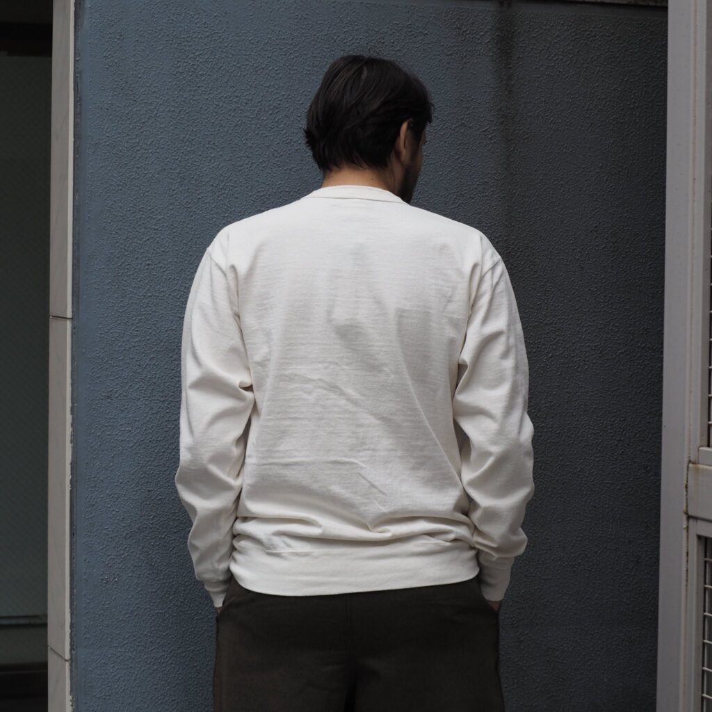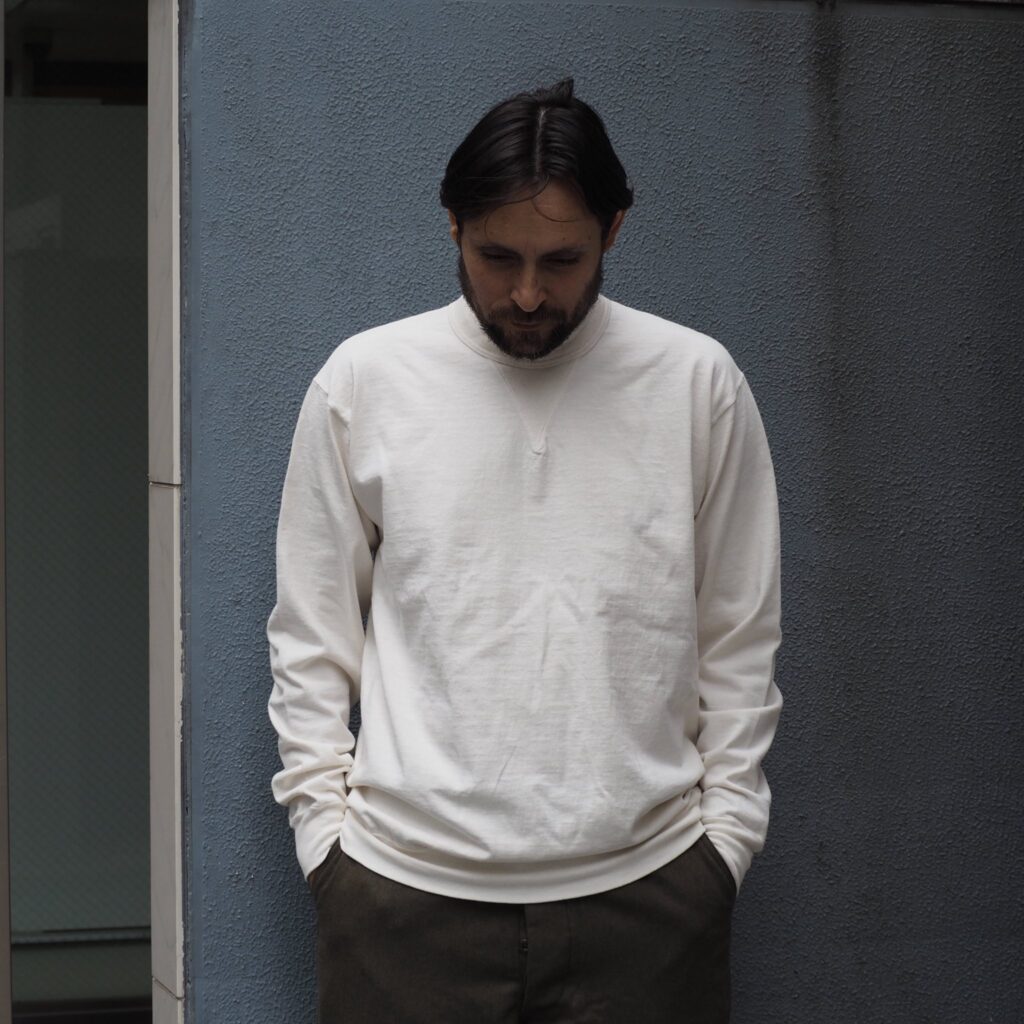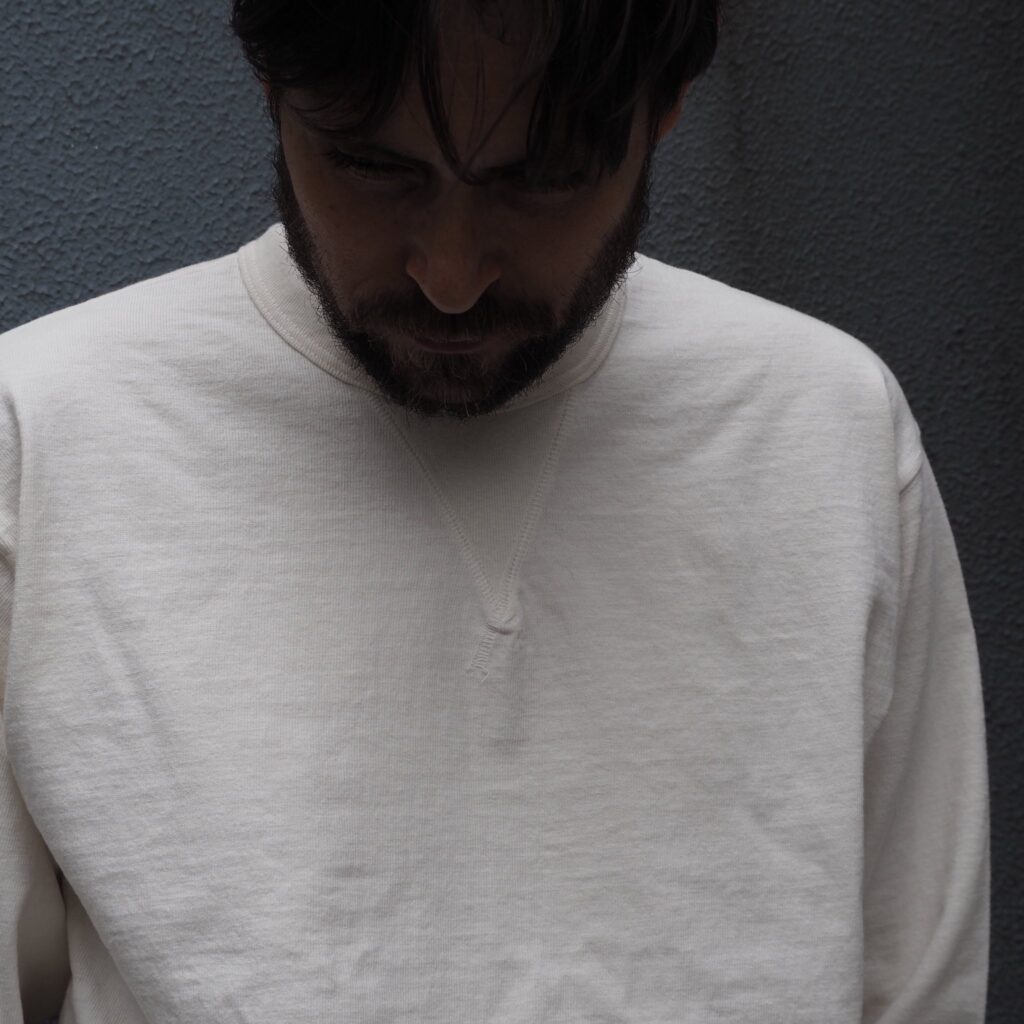 デザインは、ヴィンテージスウェットを参考に、首ぐりのフロント部分のVガセットデザイン。筒状の編み機を使用しているので、サイドシームがなく丸みのあるシルエットが独特のスタイルを演出します。
