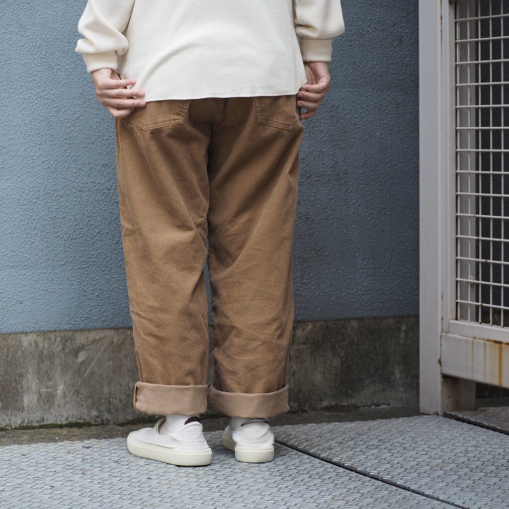 デニム感覚の5Pデザインを活かしつつ、コーデュロイの質感を損なわないよう丁寧に縫製。細部までこだわったポケットやステッチワークが、カジュアルながら品のある印象を作ります。