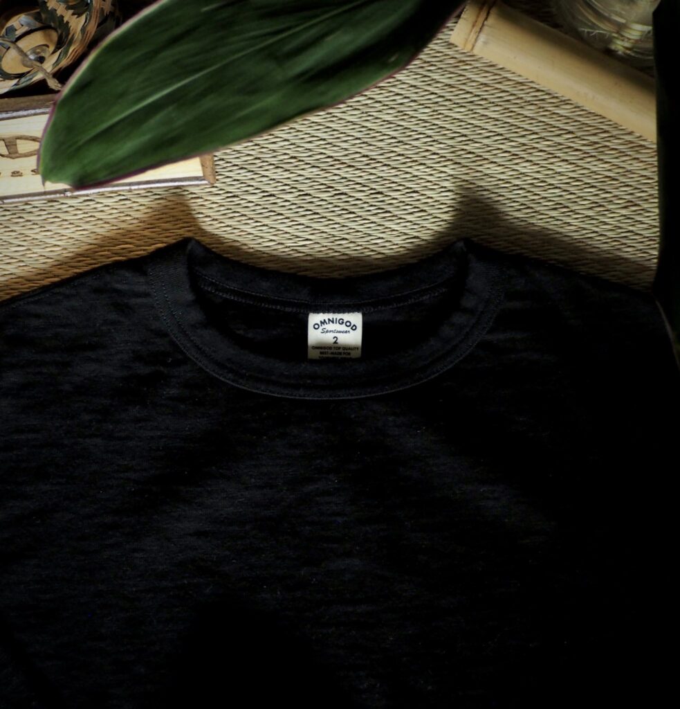 襟元は伸びにくい、太めのバインダーを採用し長く愛用できるタフな仕様に。袖口はほど良くしまったリブ仕様です。裾にはスポーツウェアのようにネームを施した、ヴィンテージ風のラベルが付いています。