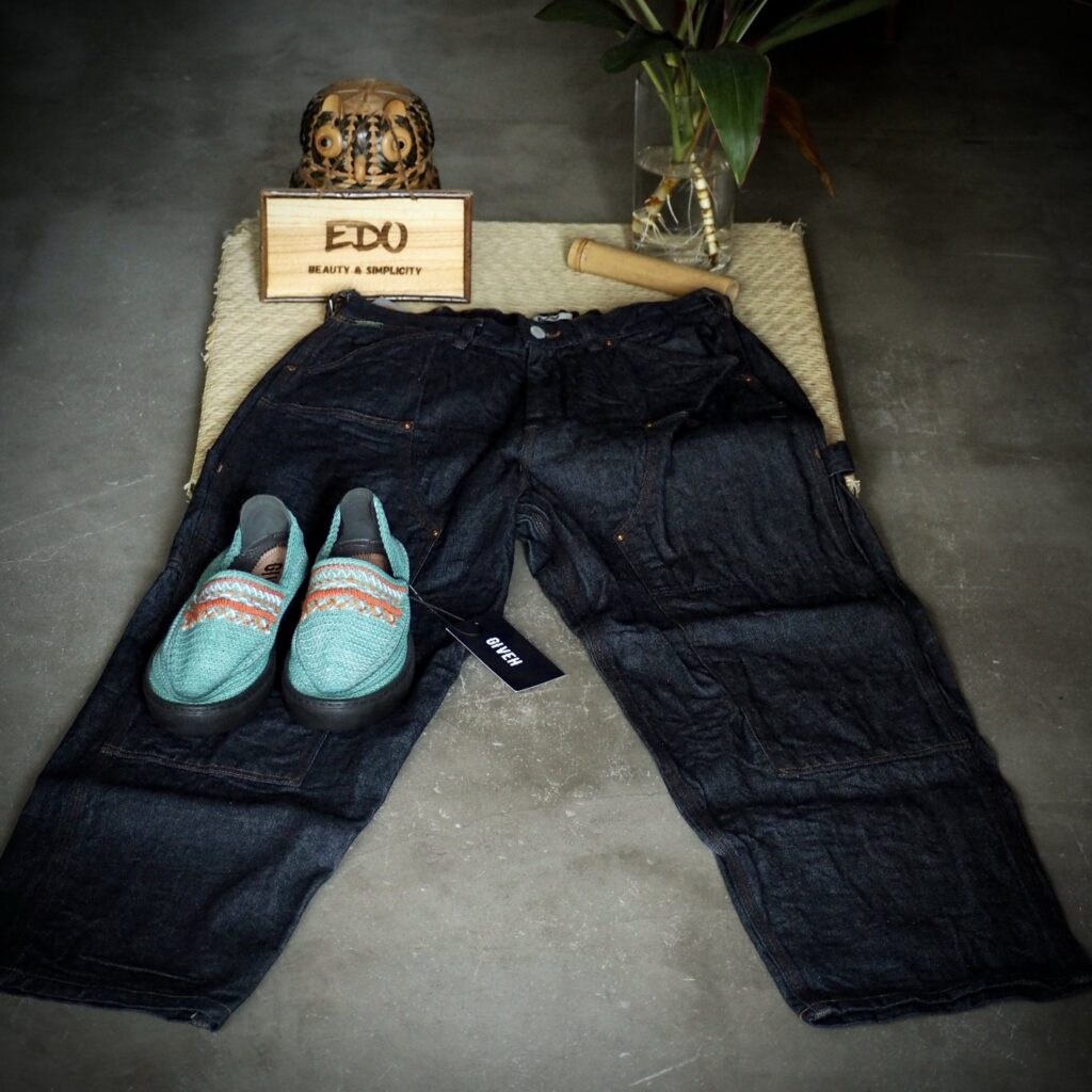 深い股上と広いわたり幅からまっすぐ下まで落ちるストレートシルエット。裾に向かって若干のテーパードを効かせているので、迫力がありながらもスッキリと着用できます。